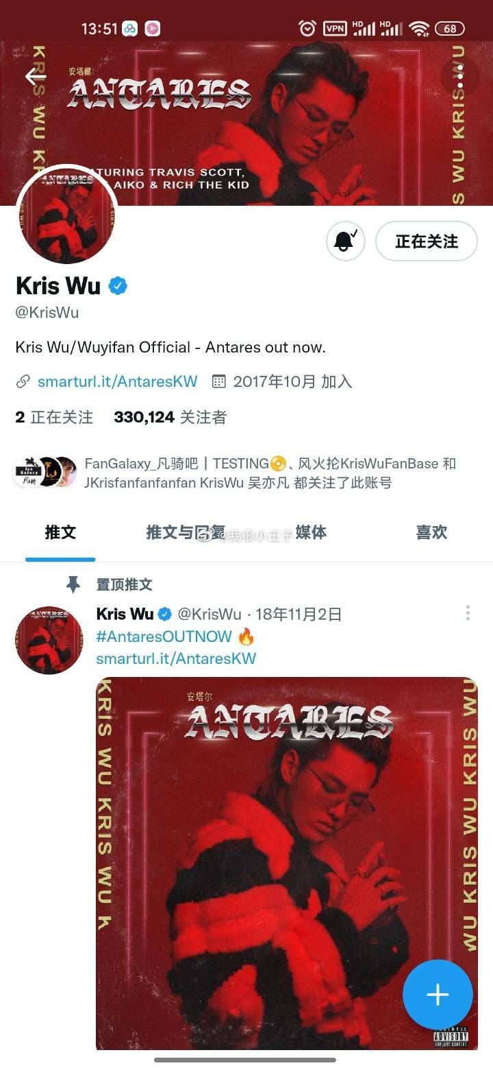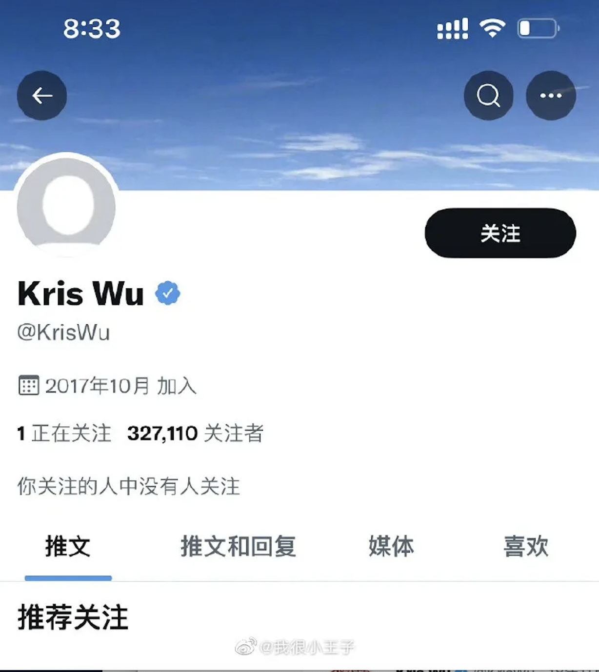 自從入獄消息曝光後,吳亦凡的微博帳號已被官方刪除,只剩下官方Twitter、YouTube官方頻道。不過日前其Twitter背景圖片從原本的紅色形象照,變成了藍天白雲,而頭像則變成沒有照片的模樣。