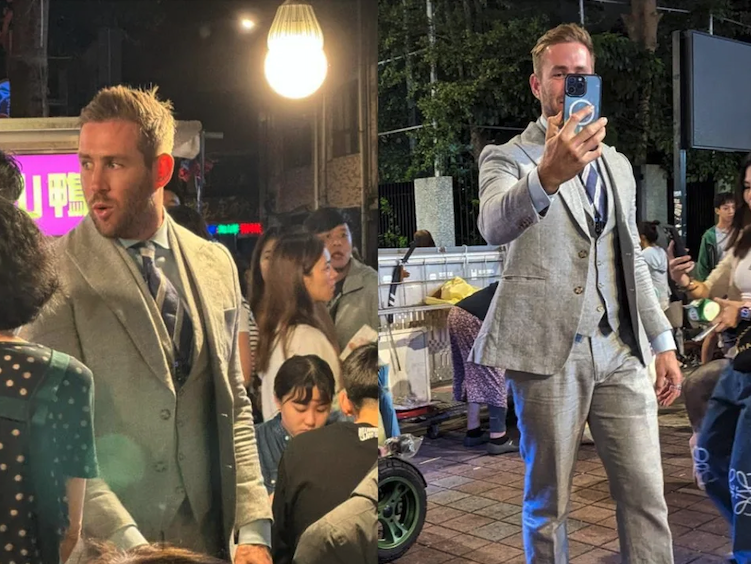 其中一張就是大家十分熟悉、位於台北的寧夏夜市,見到穿上淺灰西裝「Ryan Reynolds」,但身旁則無人與他一同旅遊。而他其後在台北車站等車時,則有超過10個市民上前要求合照,而他亦來者不拒,十分親民!