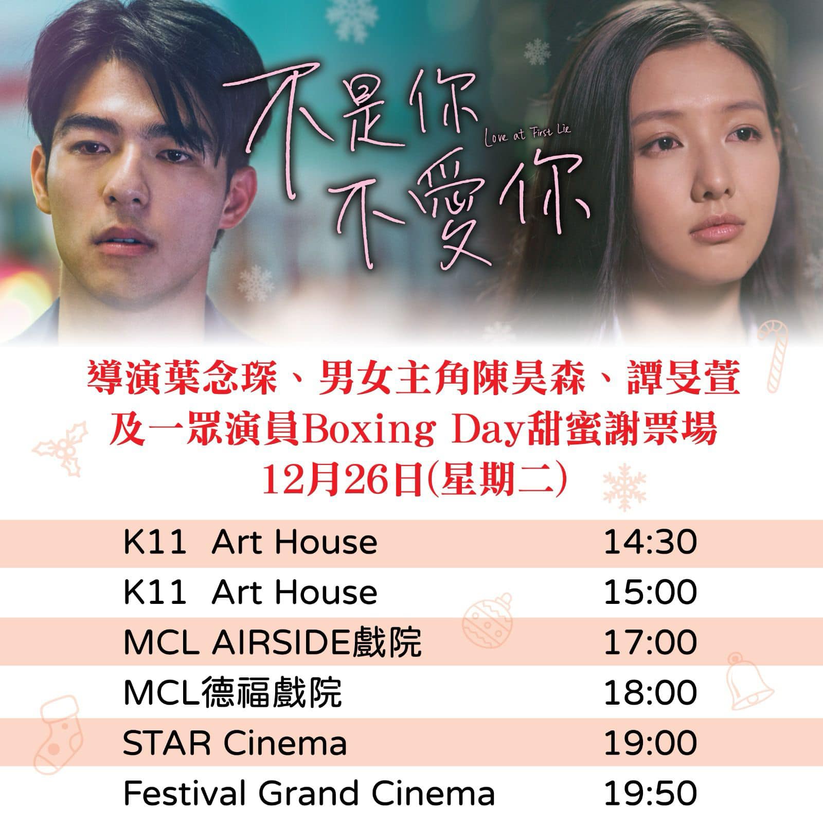 《不是你不愛你》將於12月23-26日及12月30日至1月1日推出優先場,1月18日浪漫上映,男主角陳昊森更會於12月26日來港謝票與觀眾見面。