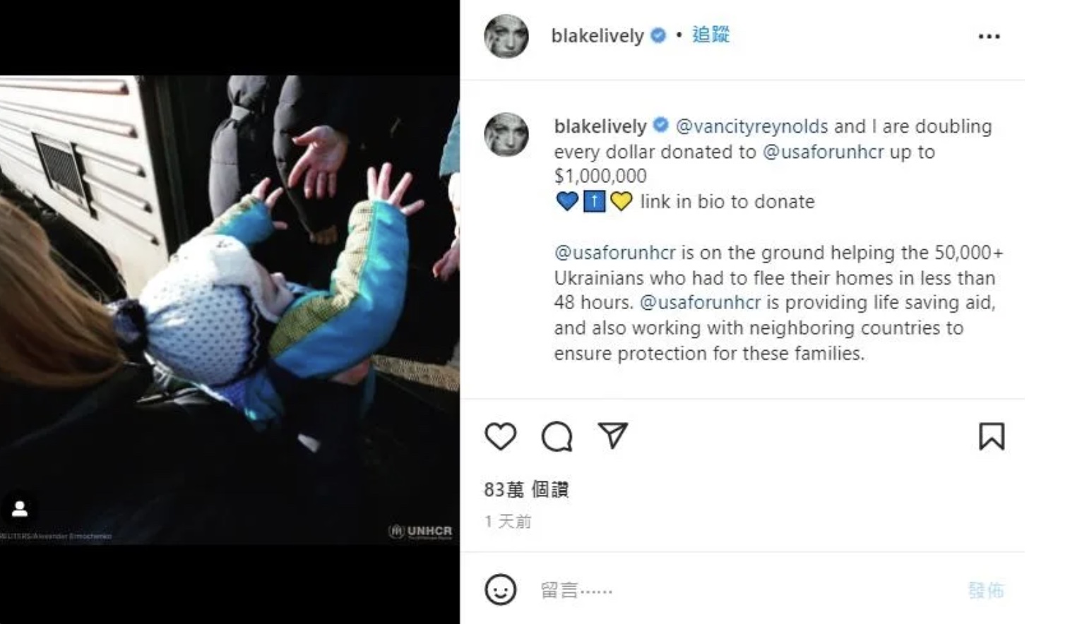 近日俄羅斯宣佈對烏克蘭展開「特殊軍事行動」後,境內多出都陷入戰火,不少民眾選擇徹夜逃離烏克蘭。不少荷里活藝人都希望透過自身影響力呼籲停止戰爭,其中「死侍」Ryan Reynolds與太太Blake Lively就與聯合國難民署募款,每當民眾捐1元美金,他們就會雙倍捐贈,希望善款可以幫忙逃離烏克蘭的百姓受到保護。