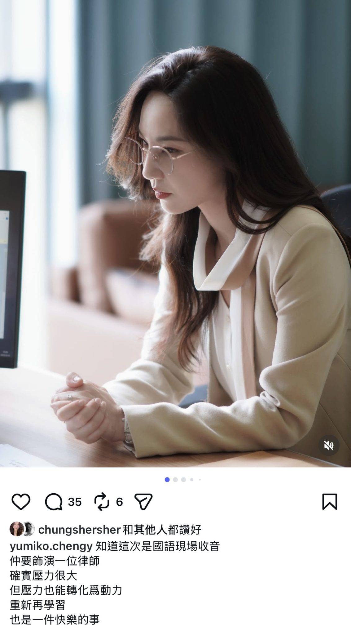 鄭希怡(Yumiko)在《女神蒙上眼》飾演律師樓資深合伙人戴佩琳,她專業能力突出、知人善任,卻因催生問題面臨各種家庭掙扎,後來終於懷上三胎,竟目擊丈夫齊文(馬德鐘飾)出軌,在第13集還遭到報復而受傷流產!有網友指她演活了現代女性的無奈和困境:「家庭事業難兼顧」、「Yumiko演技到位」、「離婚時眼底盡是淚惹人憐」!Yumiko也在社交平台表示:「真係好好睇!好鍾意戴佩琳呢個角色,獨立清醒!」她亦坦言是次演出是普通話現場收音,壓力非常大,不過普遍觀眾大讚她演出超水準,相信她可以放下心頭大石。