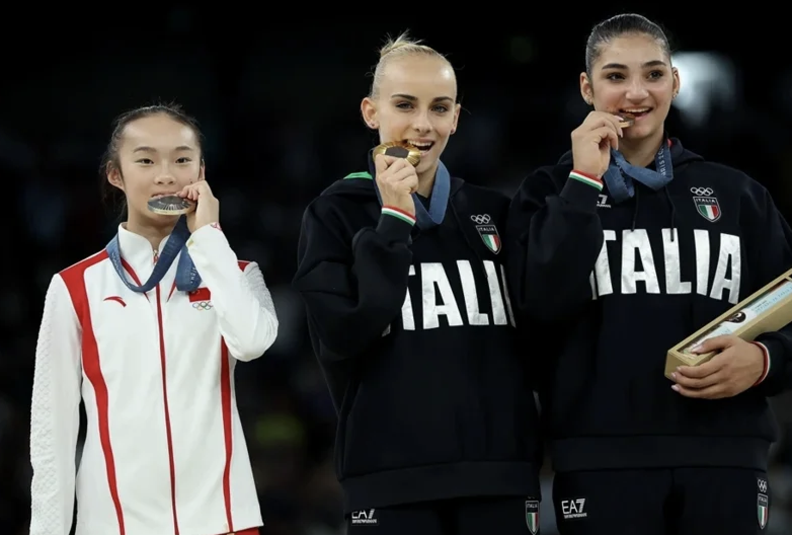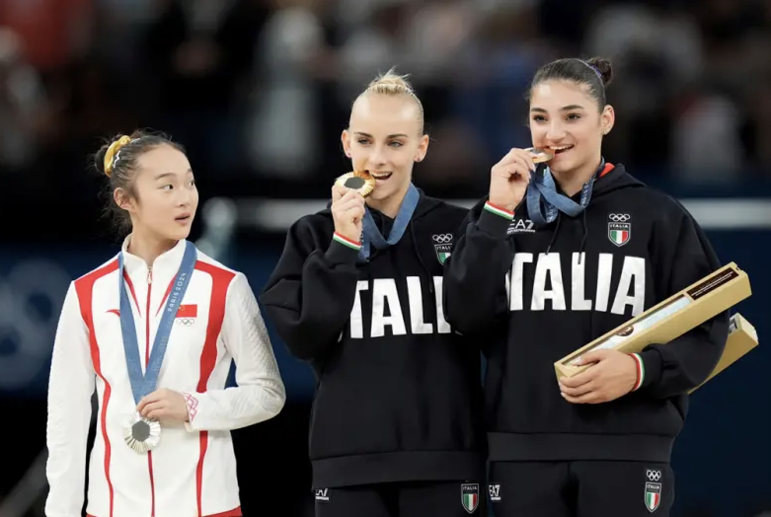 即將進入尾聲的巴黎奧運,日前舉行體操女子平衡木決賽,意大利選手Alice D’amato與Manila Esposito分別奪下金牌與銅牌,而中國代表隊成員18歲選手周雅琴則奪得銀牌。而在頒獎典禮時,周雅琴的舉動引起網民討論! 因為兩位意大利選手在頒獎台上一齊做出咬獎牌動作,在旁的周雅琴看到她們咬金牌後曾面露驚訝表情,不過她迅速模仿起這個動作,將銀牌放到嘴邊。 片段在網上瘋傳,大批網民表示周雅琴的反應相當天真、可愛,甚至形容是「將永遠成為有史以來我最愛的奧運影片」! BY DH 9 August 2024