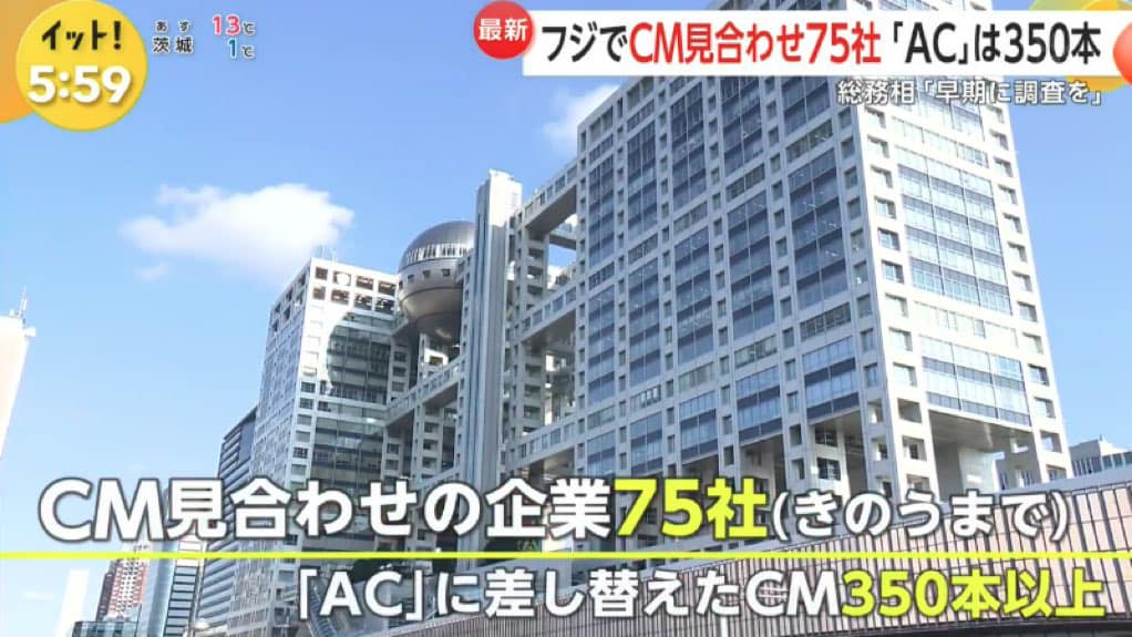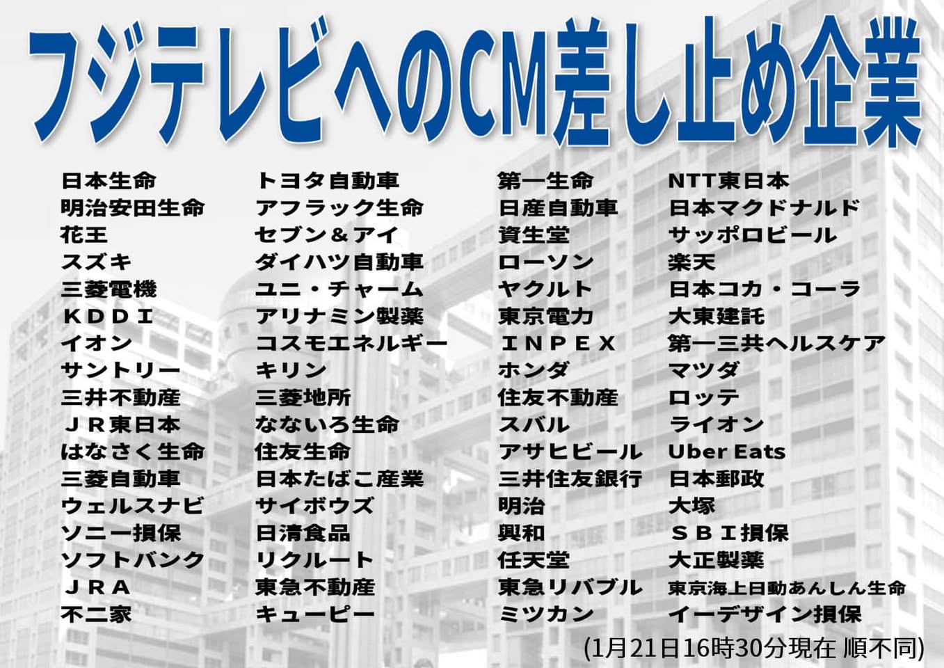 今次中居正廣性醜聞事件正面影響富士電視台的形象,目前已經有超過50家企業,包括Toyota、花王、資生堂等大公司,要求撤下在富士電視台的廣告,初步估計損失至少數10億日圓起跳;就連政府部門參與製作的電視劇目前亦停工,勢必對電視台造成嚴重打擊。
