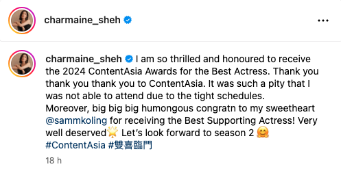 而替阿佘代領獎項的高ling在頒獎禮上,亦獲得了最佳劇集女配角獎項,亦替阿佘感到高興,「更開心係Man姐 @charmaine_sheh 再再再次得到最佳女主角,她真的值得!」