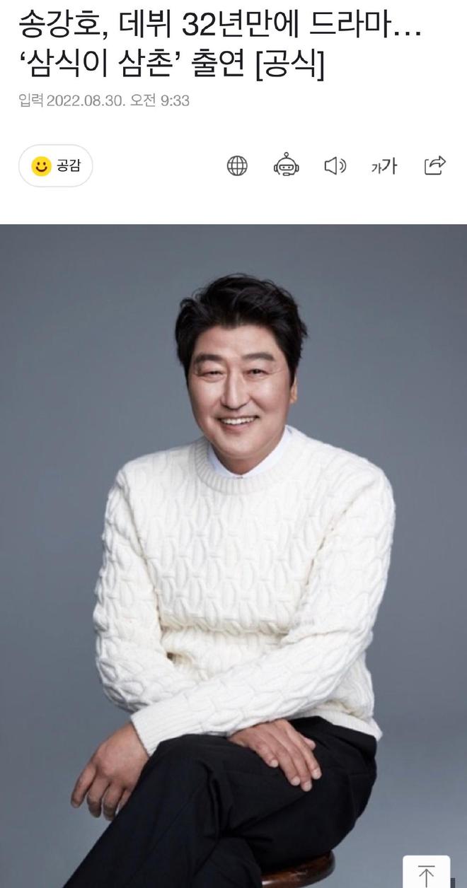 出道至今已經32年的宋康昊,1989年以話劇演員身分出道,其後在1996年出演電影《豬墮井的那天》正式出道。當中他原來從來都沒拍過電視劇,不過大家終於在明年可以看到他人生首部韓劇《三食叔叔》!