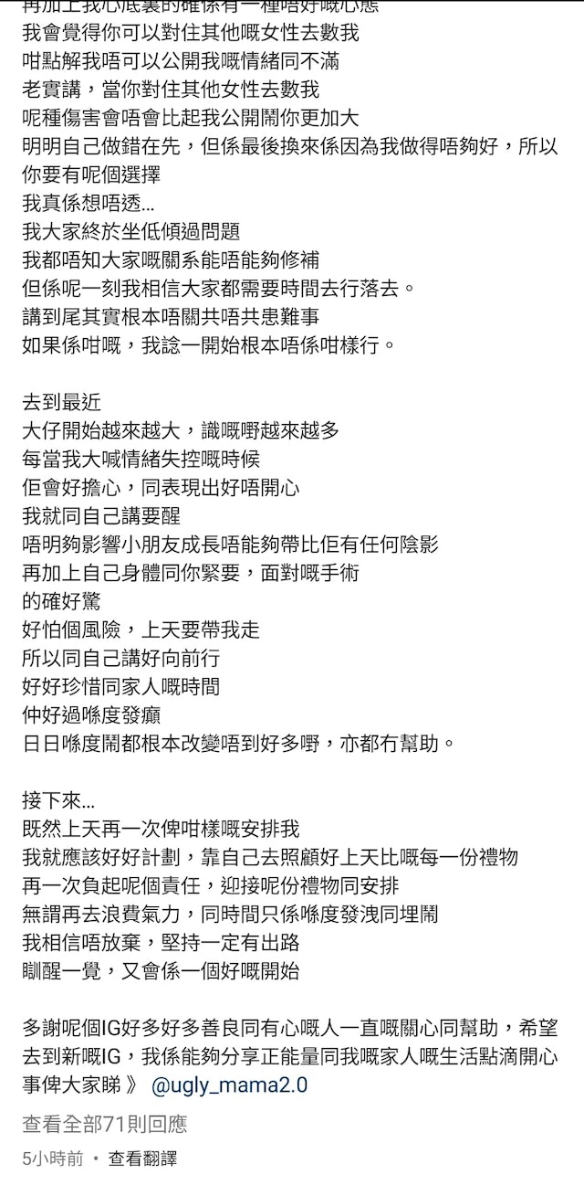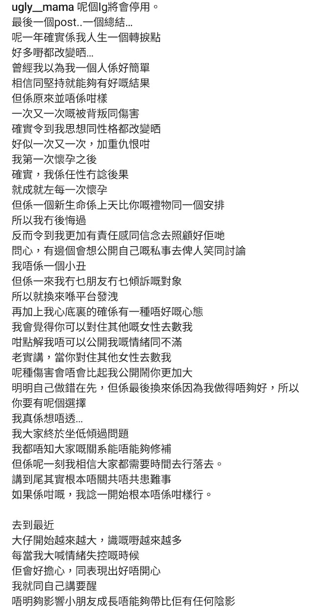 雯雯透露今次係IG最後一個po係一個總結,佢表示呢一年好多事情改變,係人生一個轉捩點。過去雯雯以為做人好簡單,只要認為只要相信和堅持有好結果,但現實卻是相反,「一次又一次嘅被背叛同傷害,確實令到我思想同性格都改變晒,好似一次又一次,加重仇恨咁。」至於同Steven嘅關係佢就話無信心可修補,「但係呢一刻我相信大家都需要時間去行落去,講到尾其實根本唔關共唔共患難事,如果係咁嘅,我諗一開始根本唔係咁樣行。」