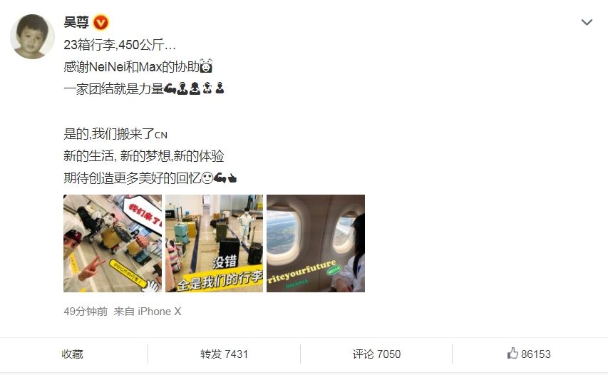 早年曾帶同仔女Neinei、Max參加內地親子真人騷《爸爸去哪兒》的吳尊,今日就在微博宣布舉家從汶萊移民內地,更pack咗一共450KG、23箱行李,一家四口在內地展開新生活!