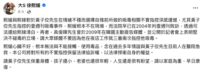 之後講到大S心臟不好,無法接觸及使用毒品,「但念在過去多年情誼與黃子佼先生目前人在醫院急救,本公司將對所有的不實指控保留法律追訴權,以法律捍衛自身的權益。」最後她們亦希望佼佼保重身體,「孩子還小,老婆也還很年輕,人生還是很有盼望,請以家庭為重,早日康復。」
