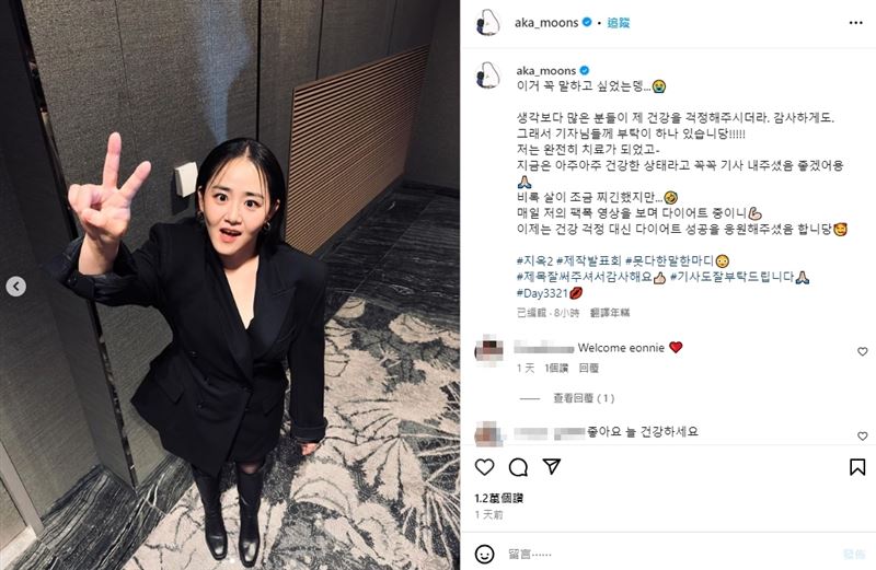 文根英以全黑造型現身發佈會,身型變得圓潤,引起不少網民討論!而她其後在IG亦表示知道外界非常關心自己的健康,強調自己已痊癒,亦知道體重變重所以每天都會看減肥影片減肥,「希望大家不要再擔心我的健康,而是為我減肥成功加油」。