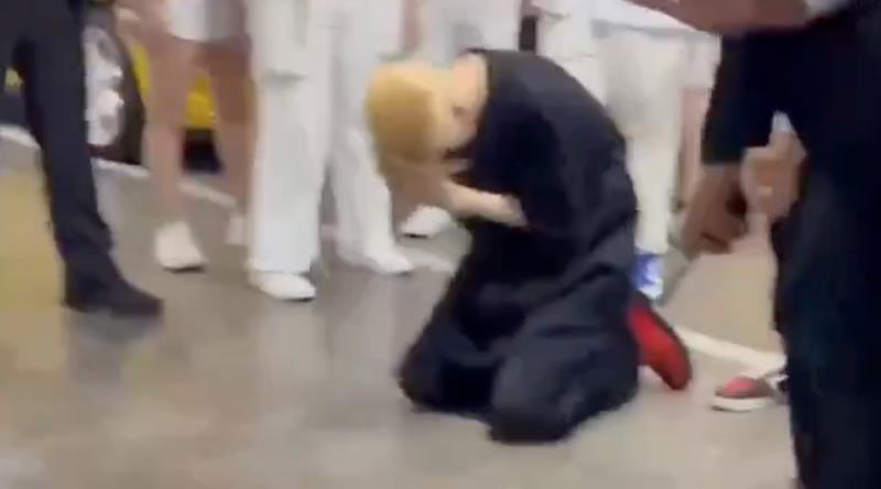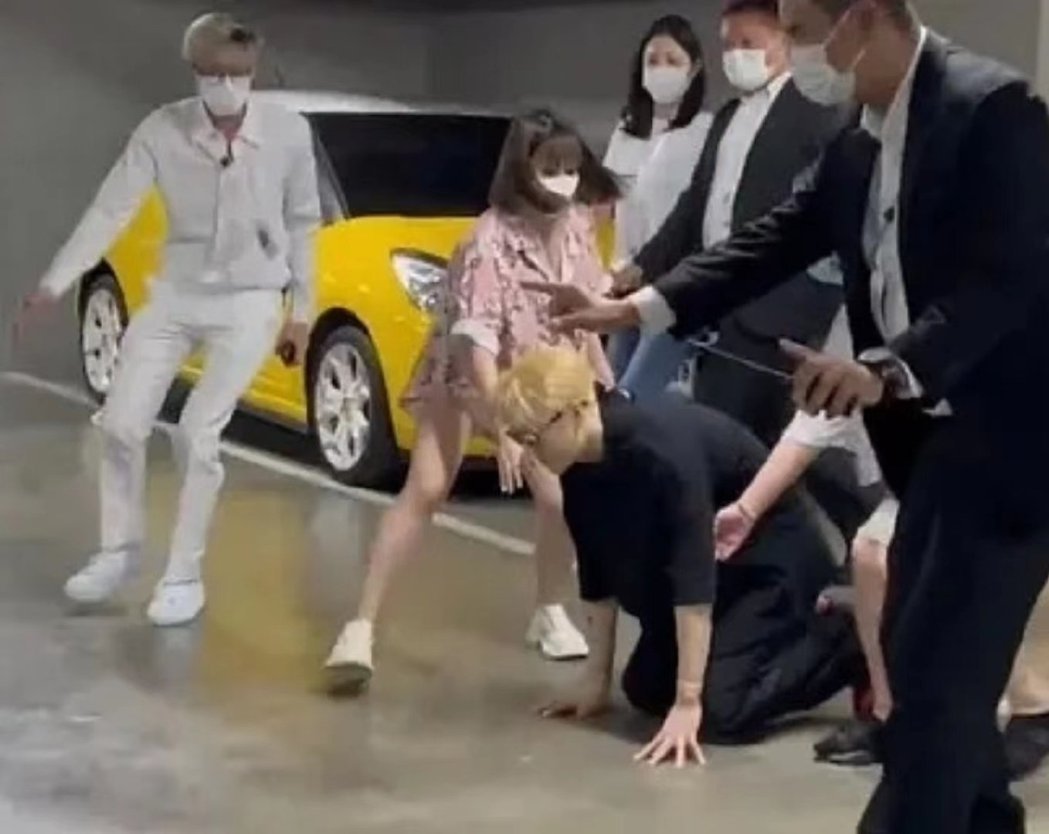 從粉絲所拍攝的片段所見,從停車場電梯間走出來的Jackson見到在場粉絲就馬上走向他們,同時示意身邊的保鑣退後,突然之間Jackson就跪在地上跪拜長達15秒後,身邊的工作人員立即上前扶起,但他撥開助理的手,令在場粉絲立即起哄。