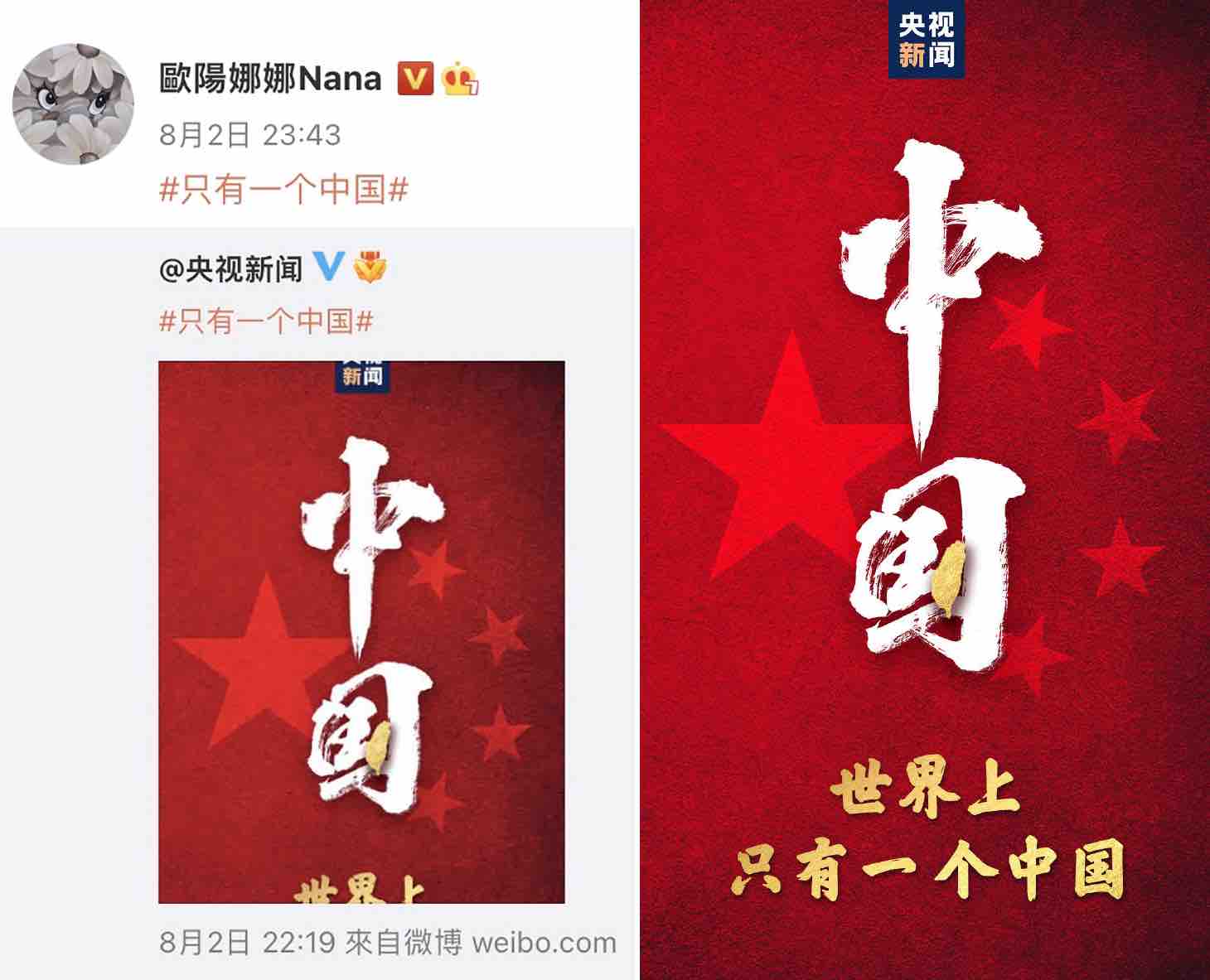 上星期美國眾議院議長佩洛西訪台,引起內地網友不滿,更點名要求台灣藝人表態政治立場。而不少近年轉戰內地發展事業的藝人包括楊丞琳、歐陽娜娜、王大陸、郭品超等,都有在微博轉發(只有一個中國)圖片。