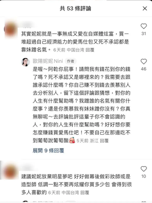 出身自演藝世家的台灣女演員歐陽妮妮,雖然入行多年但未算有代表作,近年向KOL界發展不時在個人Youtube上拍Vlog,又會買多個名牌手袋拍攝開箱片。最近就有網友到其IG留言表示歐陽妮妮愛炫富及靠妹妹歐陽娜娜名氣上位,「其實妮妮是一事無成又愛在自體炫富,買一堆超過自己經濟能力的包包又死不承認都是靠妹蹭名氣。」