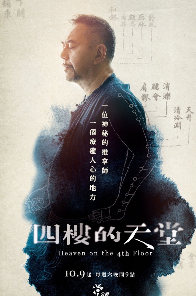 去年年尾到台灣暫居的影帝黃秋生,除了主持節目實境節目《開著餐車交朋友》外,更首度拍攝台劇《四樓的天堂》!日前《四樓的天堂》劇組播出預告,並宣布將於10月9日播出! 《四樓的天堂》演員陣容可以說超有實力,女主角是金馬影后謝盈萱,另外還有曾在金鐘獎及金馬獎的演員例如有范少勳、黃姵嘉、潘麗麗、太保等。秋生哥在劇中飾演一位神祕推拿師,預告中他說到,「身體不是沈默的,我的手常讀到很多的祕密。」原來是透過推拿接觸感受到人們心底的傷痕,以助他們療癒化解。秋生哥在拍攝前亦落足功夫,與推拿師父學習不同手法,亦安排推拿顧問在現場指導,他直言滿意度有100分,「這次的合作非常好,跟導演也非常有默契。」 四樓的天堂黃秋生 BY DH 30 July 2021