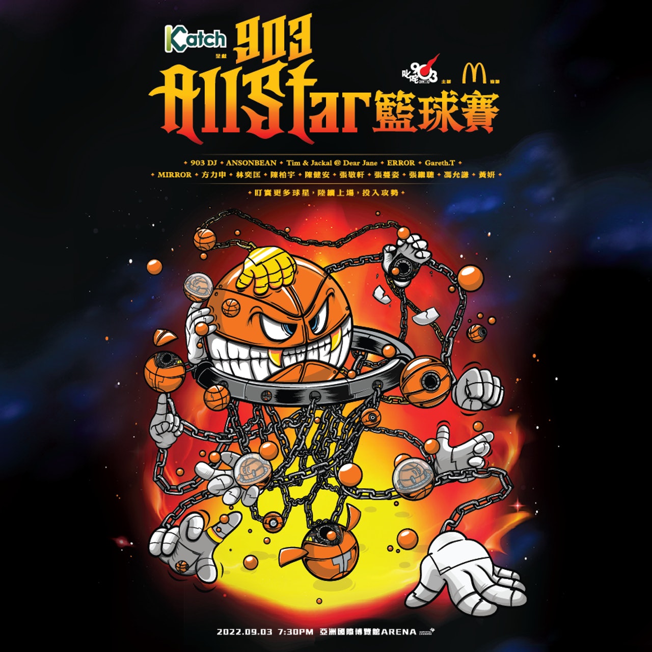 上一次舉行《903 AllStar 籃球賽》已經是十年前,就連周杰倫、陳百強都曾參與,據知,籃球賽將於9月3日晚上7時30分在亞洲國際博覽館Arena舉行,同場更有張敬軒、MIRROR、ERROR、ANSONBEAN、DearJane成員Tim 及Jackal、Gareth.T、方力申、林奕匡、陳柏宇、陳健安、張蔓姿、張繼聰、馮允謙、黄妍,難得MIRROR、ERROR同場出現,粉絲必睇!