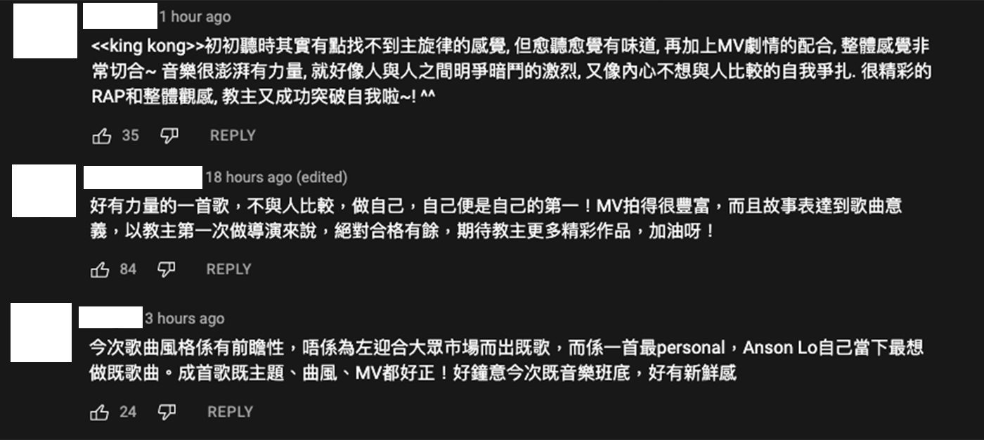 不少神徒亦力撐教主的新歌,在 MV 未播出時已在留言區為他打氣,MV 播出後更馬上登上香港 YouTube 音樂類別的第一位,看出教主人氣高企!雖然神徒們認為 Anson Lo 的新歌「成功突破自我」、「風格很有前瞻性」、「MV 拍得很豐富」,但似乎跟網民意見兩極。