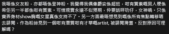 不過Edan的「真情剖白」就引起一班「爵屎」不滿,更直言自己因為這段緋聞加上偶像的言論,出現一股「脫粉潮」。