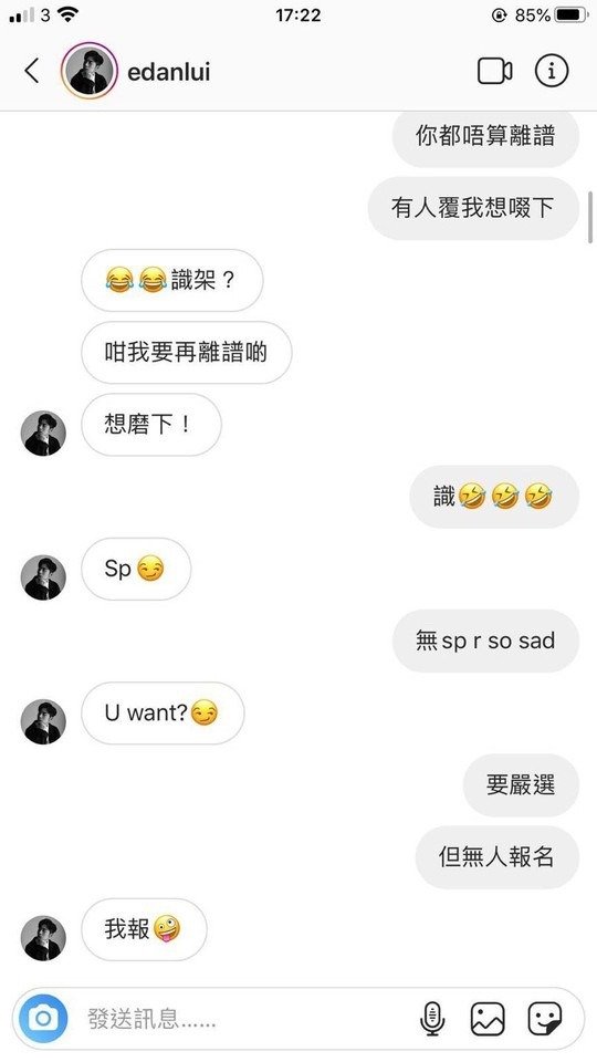 之後網上就開始流傳幾張疑似Edan與女性友人在IG挑逗對話圖,當中有提到「想一啖食咗你」、「想磨下」,不過網友就認為IG圖可信程度不高,因為IG圖上Edan的IG並無「藍剔」認證,認為有人想陷害Edan。而當事人Edan至今仍未就事件作出任何回應。
