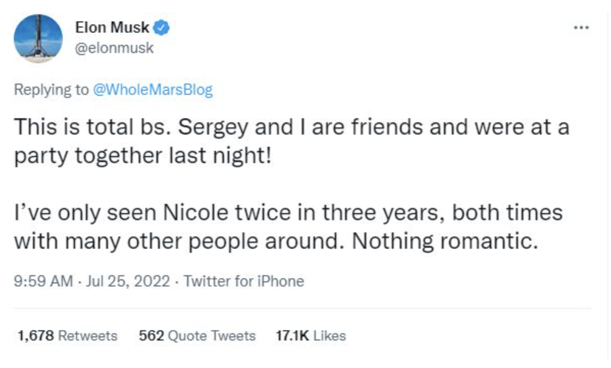 對於「偷食」好友妻子傳聞,Elon Musk亦立即在Twitter上發聲明澄清,指報導完全是「老作」,更表示日前先與Sergey Brin一同出席聚會,「我在3年內只見過nicole2次,旁邊都有很多人,沒有任何浪漫元素。」