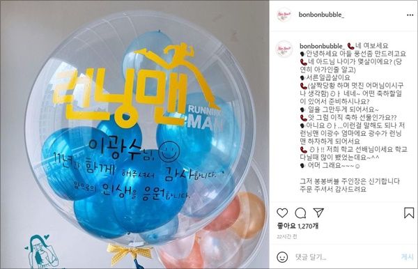 而媽咪在氣球上寫下的祝賀語分別是「辛苦了,兒子!感謝11年間與#Running Man一起合作的李光洙。為李光洙的未來加油。」