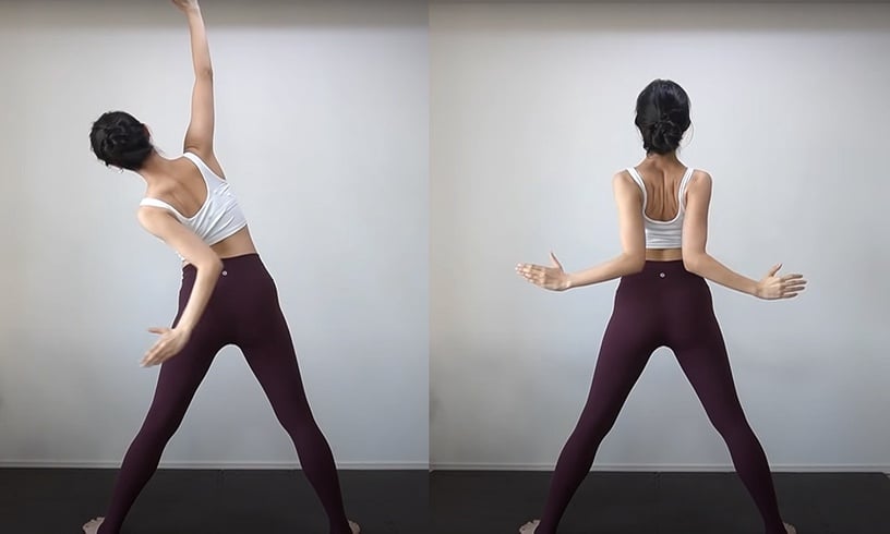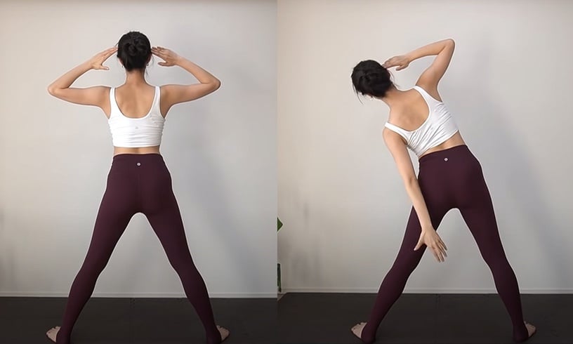 舉高雙手,身體向右擠壓側腰,然後右手手肘彎曲並擺至身體後方,左右邊各做完才算是一組動作,這個動作可以同時可以訓練手臂、背部肌肉~