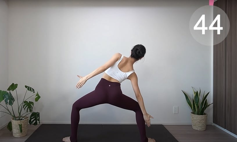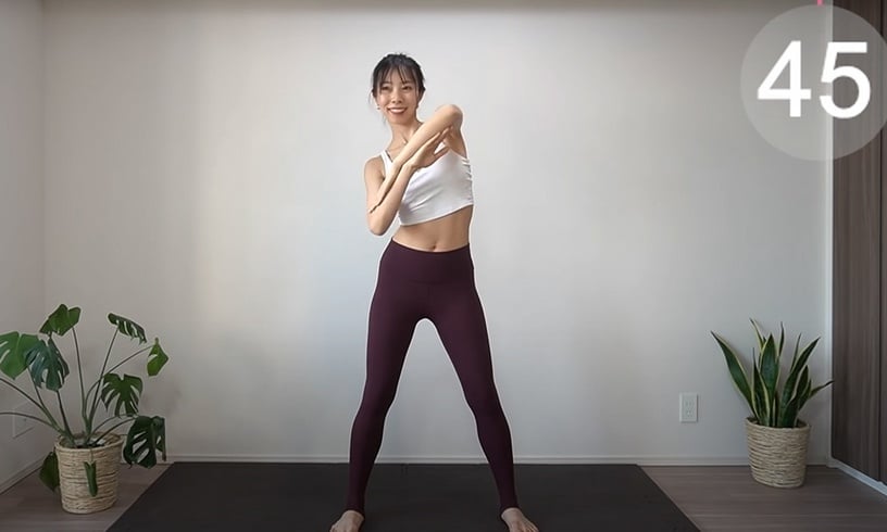 雙腿打開到比較闊的跨度,雙手合十向上舉,然後慢慢蹲下,將身體輪流往左右擺動腰部,然後雙腿站直,重複動作40秒。