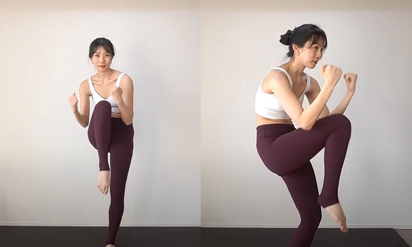 將手臂舉至頭頂,將一腳抬起至胸前,順便靚手帶下來,動作中有擠壓腹部的感覺就算正確。