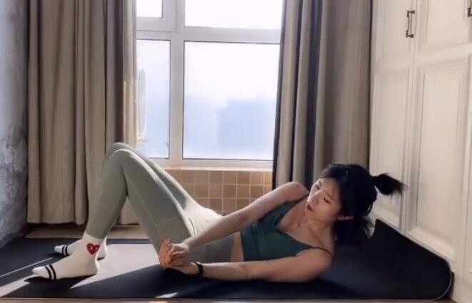 腰部貼緊地面,腹部微微捲起,雙手向身體兩側扭轉,可鍛鍊側腹從而緊緻側腰。