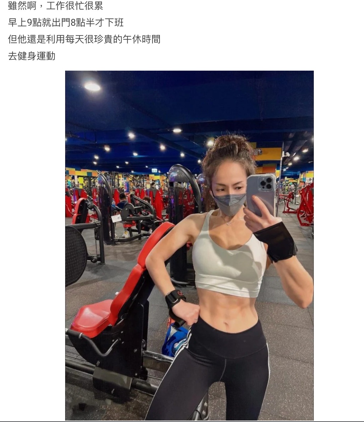 凍齡媽媽於24歲時生下樓主,幾年前又誕下小女兒,但歲月似乎沒有在媽媽身上留下痕跡。雖然媽媽年紀快到5字頭,但自2年前愛上健身後便一直醉心,職業是一名廚師,而且是煮大鍋的料理,需要一定臂力!而且早上9時出門8點半下班,但媽媽一直堅持利用午休時間去健身做運動,卸下圍裙就是個健身辣妹。