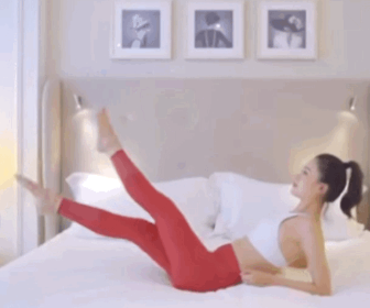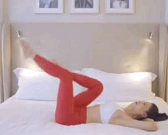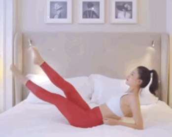 平躺在床上,上半身保持穩定,一隻腿彎曲靠近腹部,另一隻腿腳尖朝內慢慢往上蹬至90度,兩腿交替進行,有效刺激腹部與腿部線條。