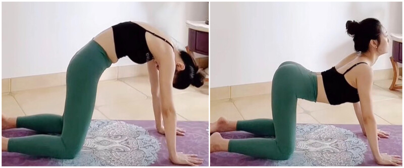 進入四足跪姿,吸氣時抬頭拱背延展腹部,吐氣時低頭收腹拱背,脊椎一節節流動如波浪。