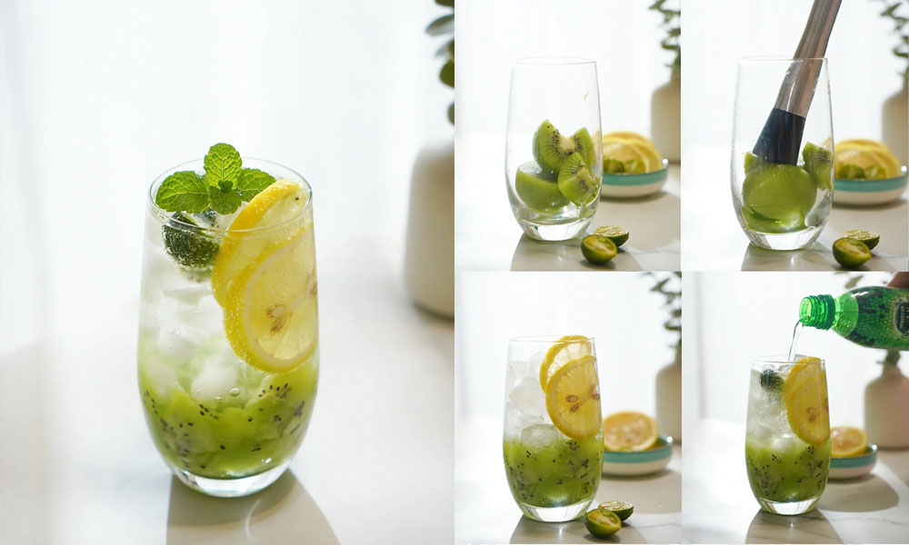 將奇異果放入杯子搗碎,加入冰塊、檸檬、青檸和梳打水即可,想更美觀的話可以加上薄荷葉做裝飾,酸甜口味夏天開胃~