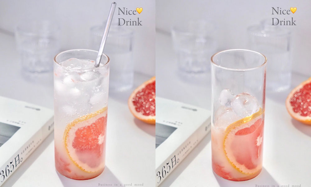 先倒入西柚的果肉,將方塊加置7分滿,倒入半杯益力多,想更健康的話可以選擇低糖益力多,再倒入梳打水就完成啦~