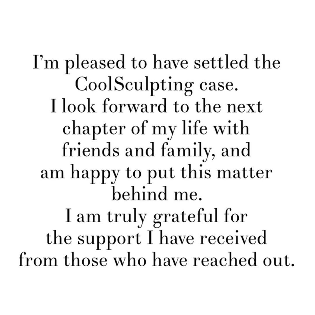 她最後決定控告療程公司,要求賠償五千萬美金。多年後, Linda Evangelista 勝訴,且在社交媒體公開自己的感受。她表示很開心解決了這件事,事件終於可以告一段落。並且感謝這段時間一直支持她的人,她期待與朋友及家人開展新的人生篇章。