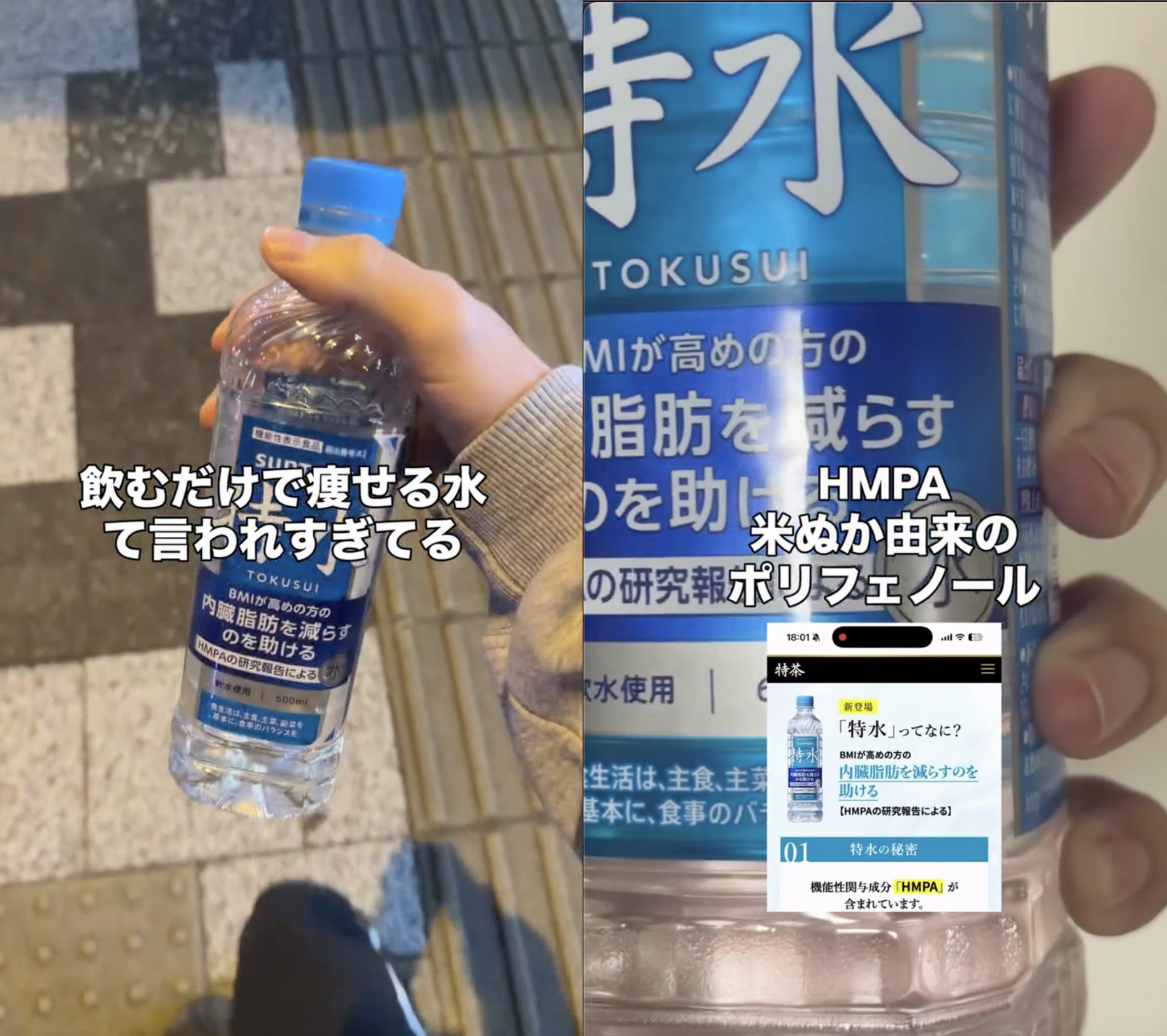 這款「特水(とくすい)」透明、無色、幾乎無味,最大賣點就是能「直接取代日常飲水」,讓保健變得更輕鬆!其核心在於 Suntory 添加的功能性成分 HMPA——一種源自發酵米糠、無色無味的成分,品牌宣稱能,活化脂肪分解酶、增強人體在日常活動中燃燒脂肪的能力、促進代謝,從而減少內臟脂肪,有研究顯示,在 連續 12 週間飲用 的受試者中,腹部內臟脂肪有明顯下降,亦因此成為特水的最大亮點!
