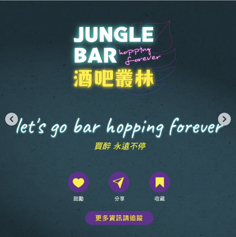 「酒吧叢林JUNGLE BAR」源於一群新創玩家&品酒愛好者組成,搭上最熱門的NFT社群鏈,直接打造一個連結全台酒吧 x 飲樂同好 x NFT玩家的酒吧生態系。與JUNGLE BAR合作的酒吧,將加入社群成為陣營酒吧,並共同舉行線上&線下癮樂活動,為酒吧增加知名度!
