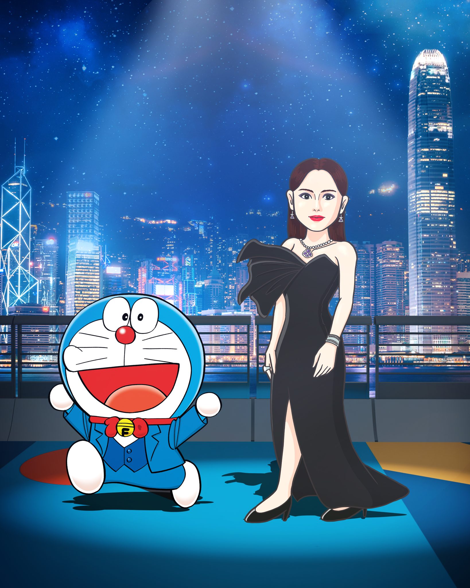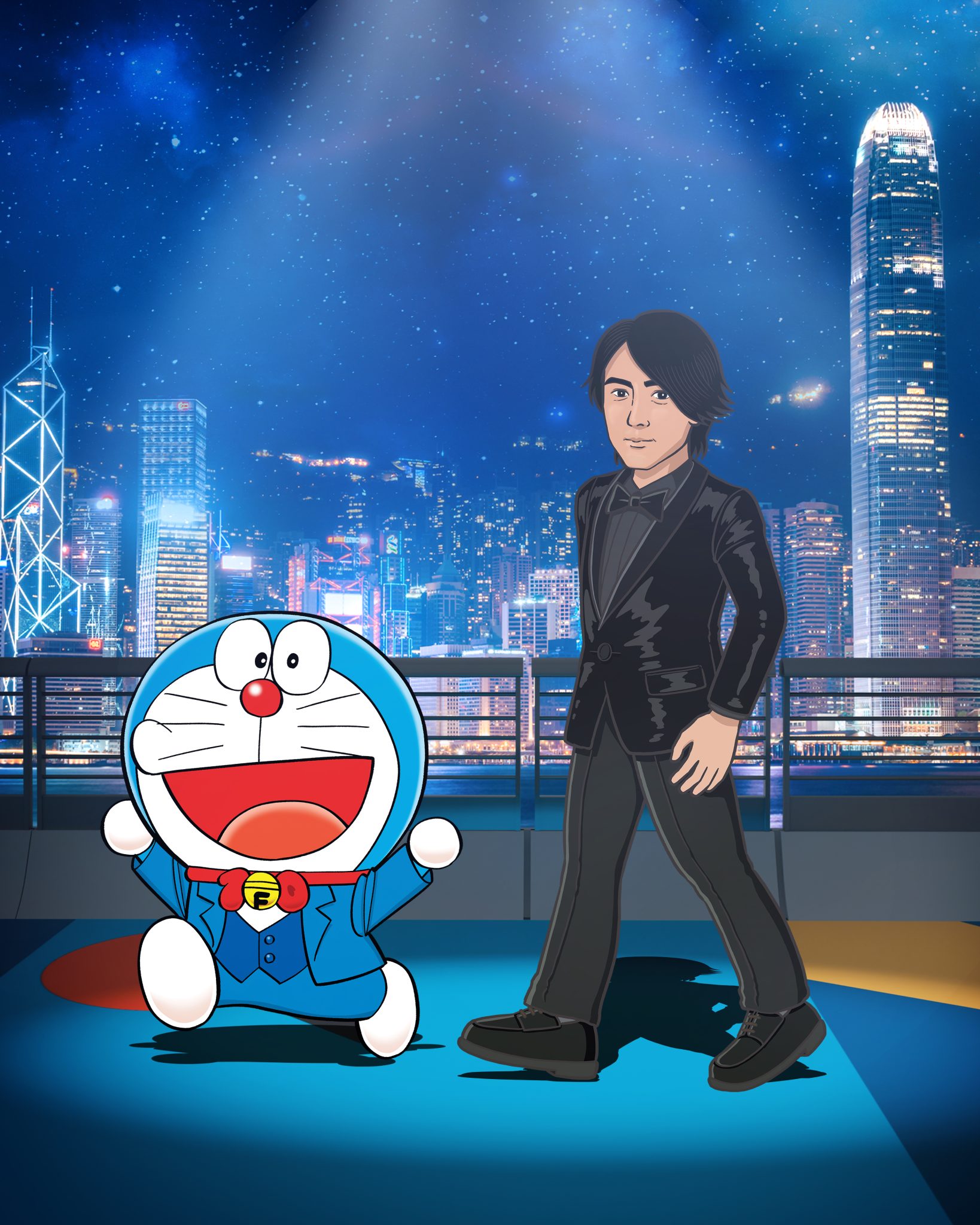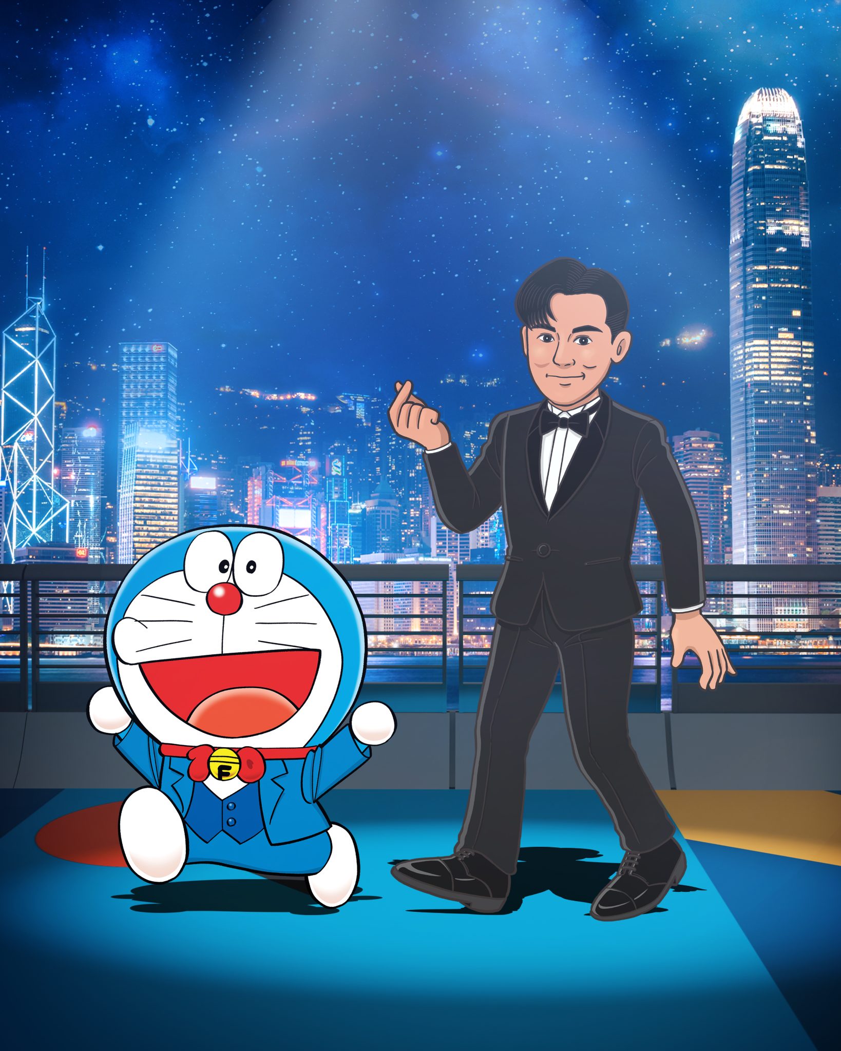 而這 13 位香港電影工作者就包括曾為「多啦A夢」及不少電影角色配音的已故資深配音員林保全、羅蘭、杜琪峯、古天樂、周杰倫、陳法拉、吳彥祖、鄭伊健、林峯、林雪、周秀娜、劉俊謙及袁澧林(排名不分先後),將會以漫畫化的禮服造型亮相,陪伴這13位漫畫人物共同踏上長約100米、以多啦A夢主題顏色為創作概念的「藍」地毯。