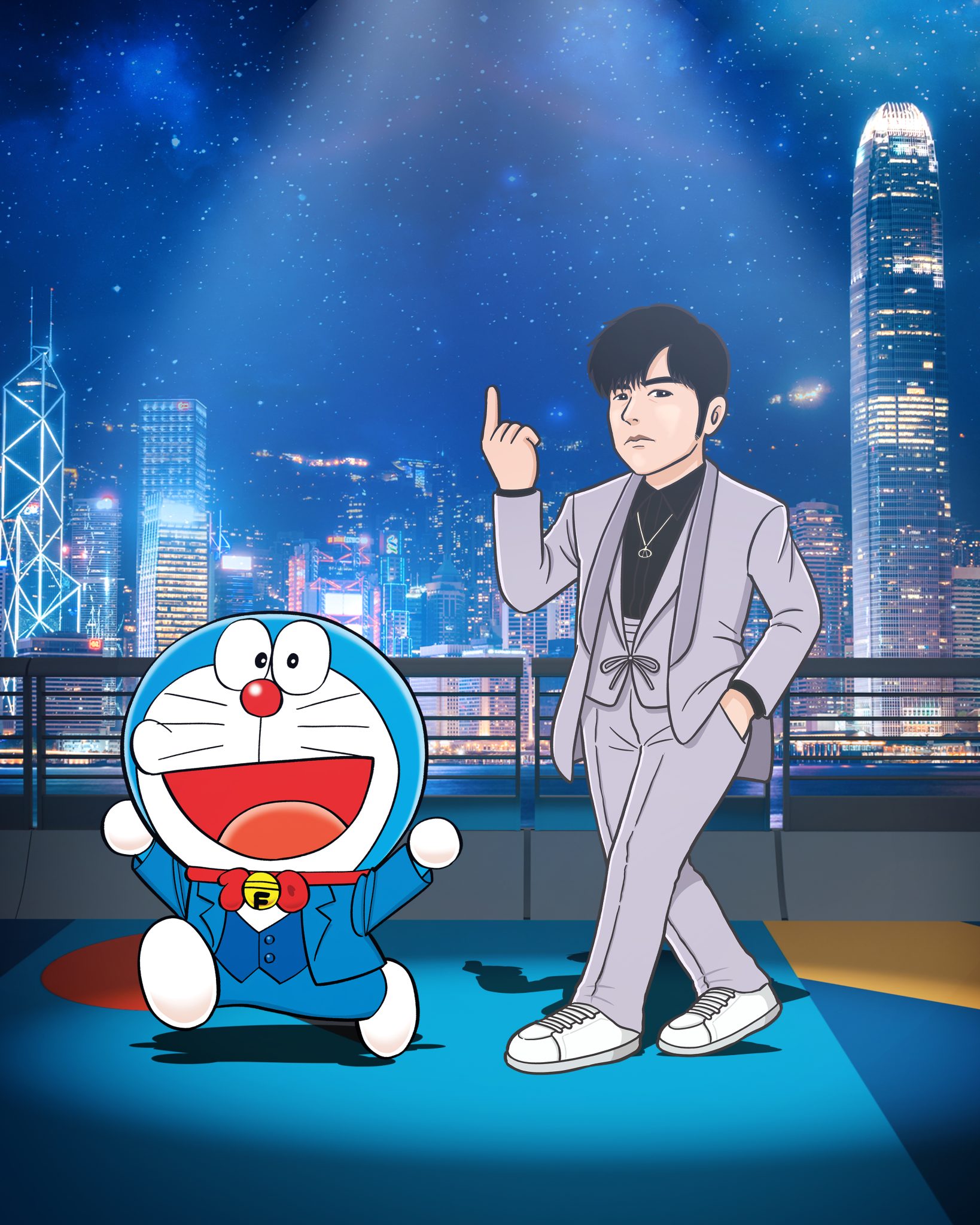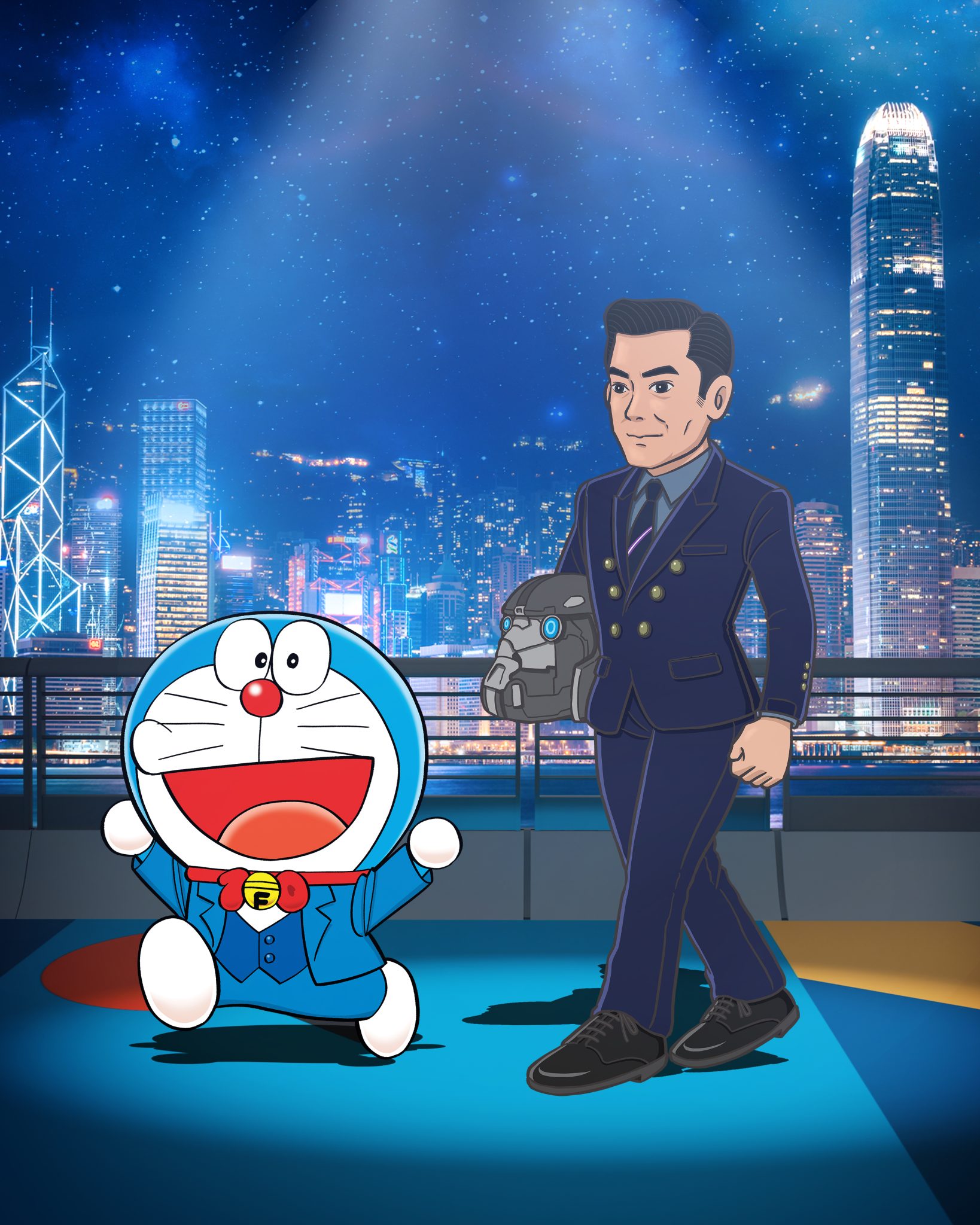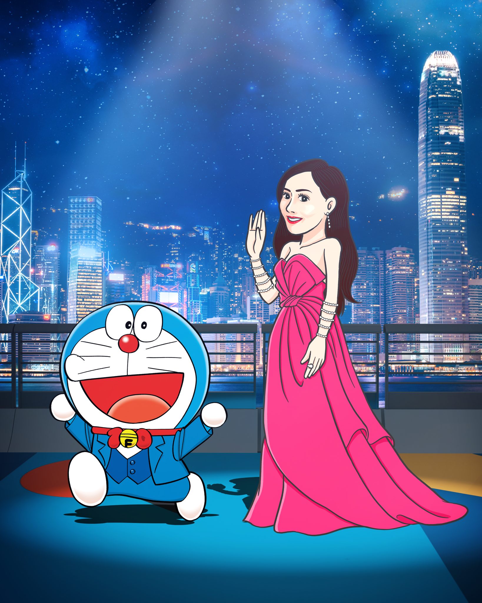 而這 13 位香港電影工作者就包括曾為「多啦A夢」及不少電影角色配音的已故資深配音員林保全、羅蘭、杜琪峯、古天樂、周杰倫、陳法拉、吳彥祖、鄭伊健、林峯、林雪、周秀娜、劉俊謙及袁澧林(排名不分先後),將會以漫畫化的禮服造型亮相,陪伴這13位漫畫人物共同踏上長約100米、以多啦A夢主題顏色為創作概念的「藍」地毯。