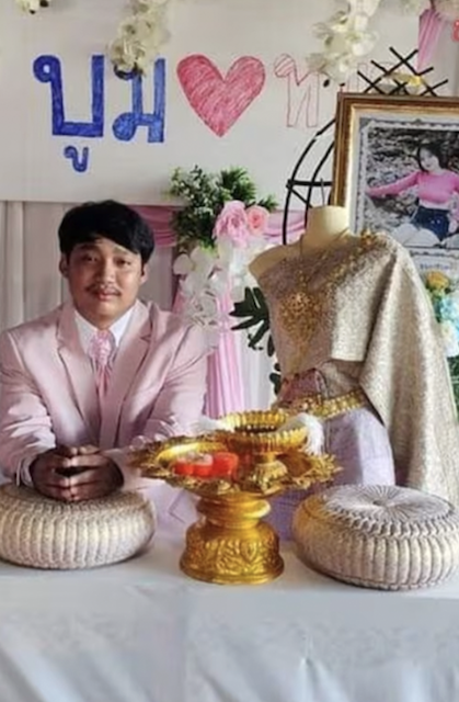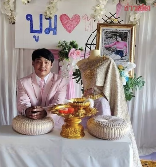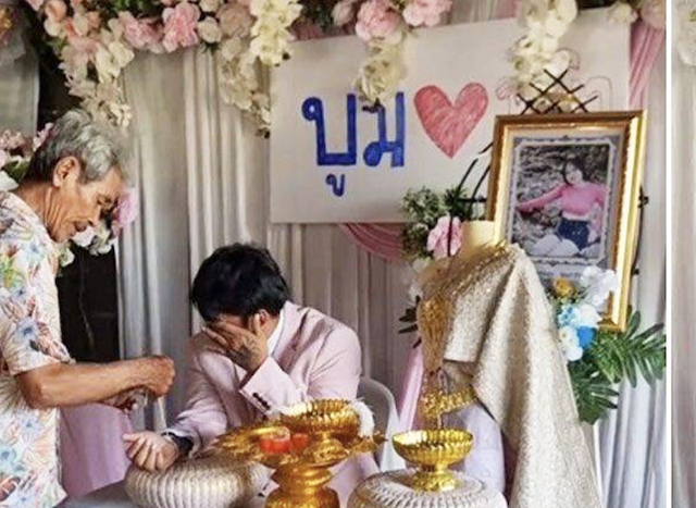 男友在網上發佈消息,邀請親戚朋友們在女友喪禮上一同見證「結繩禮」,在泰國而言「結繩禮」是傳統婚禮儀式,此舉為男友及女方家人帶來慰藉,新郎穿上淡粉色服裝、女方則披上紫白色婚紗,兩人坐在台中受親友們澆水祝福。