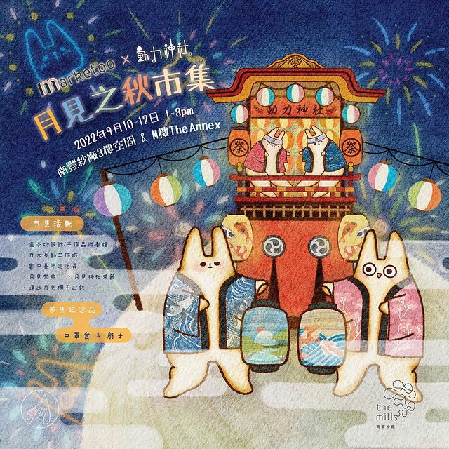 南豐紗廠今年聯乘Marketoo和本地插畫家舉行「月見之秋市集」!除了有近 200 間本地設計及手作品牌參加,亦有9大工作坊及月見節傳統的市集活動,如月見祭典、求籤神社等!P.S. 大家記得要留意機動電視台的首個市集檔位!因為鄭中基會擔任限定店長,詳情請他們的社交平台。
