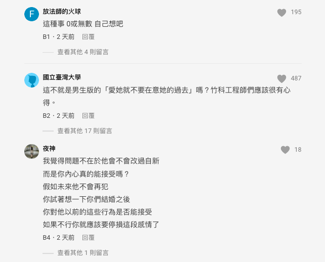 因為樓主感受到男友是對自己認真的,所以最後選擇和好。可是樓主也一再告訴男友,自己會時不時「發作」想起男友那段「很噁心令人髮指」的往事,而男友也說自己會無條件接受。