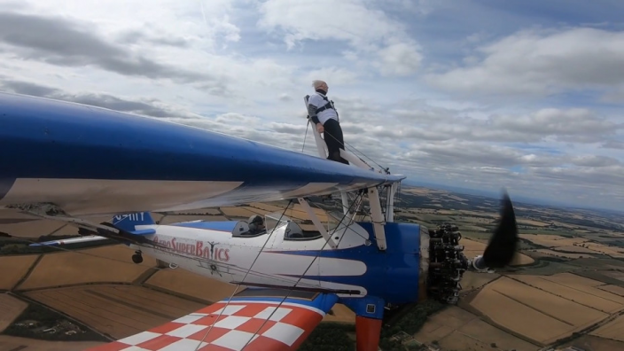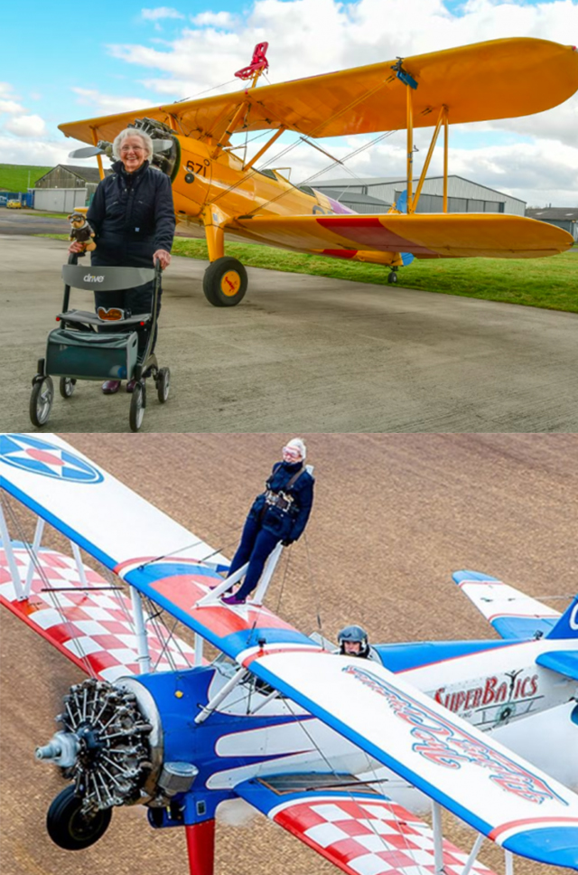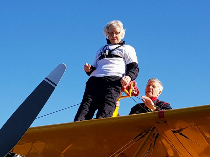 93歲婆婆當年受到電視廣告中的特技啟發,在87歲時第一次挑戰「機翼行走 Wing Walking」運動,至少已經過5次表演。機翼行走是指挑戰者在傳統的雙翼飛機飛行時爬上機翼,基於安全考量,挑戰者通常不佩戴降落傘以免線條纏繞發生意外,轉為使用吊帶及電纜等安全裝置。