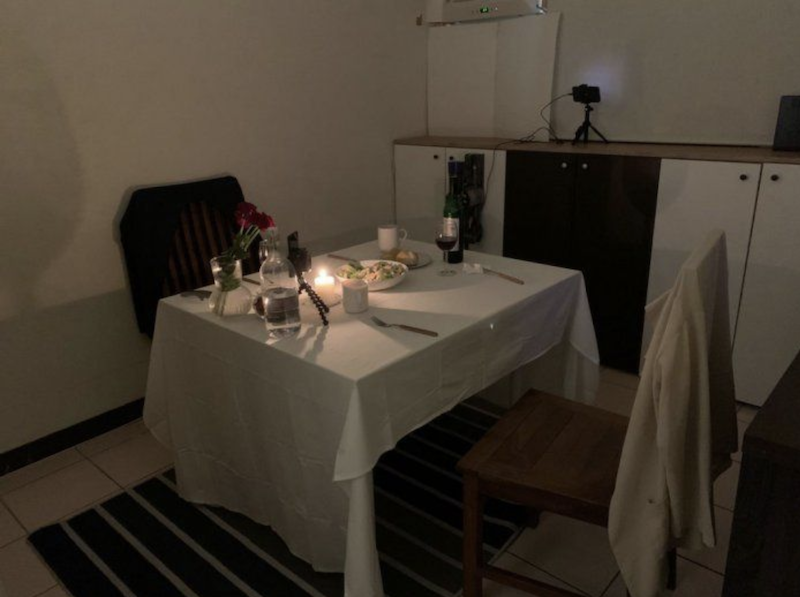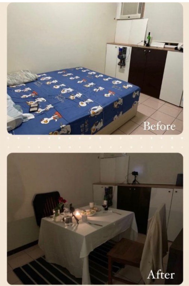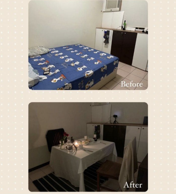 男友表示由一個月前已經決定好要將房間打造成餐廳,換上白色桌布,點上蠟燭及玫瑰花,微微的燈光仿似浪漫的西餐廳!由場地環境、餐單、頭盤、主菜、甜品(四個月前提前預訂),為了把桌子移動到房間進行佈置,決定將床榻整張收起,當天晚上就睡在地上,為的只是給女友一個驚喜!