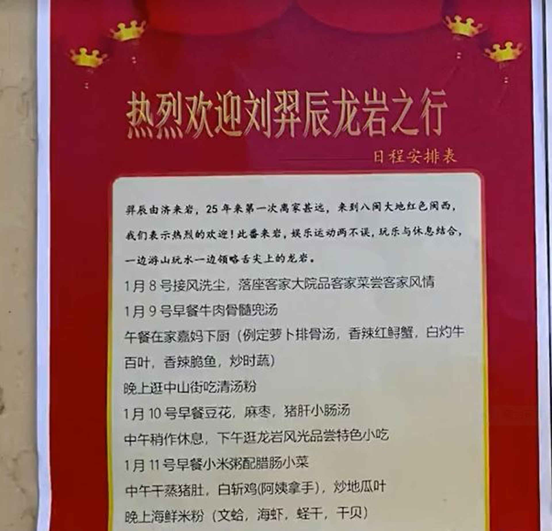 劉羿辰本以為驚喜就此結束,到家後發現廳中竟然拉起橫額,紅底黃字寫道:「歡迎愛媳羿辰回家」,更放起炮杖慶祝。然後男方媽媽給予入門利是,男方爸爸則替她拿行李進門,再將家中狗狗提早鎖起,以免嚇到劉羿辰。兩老更精心設計十日行程,照顧好三餐及景點,可見用心程度!