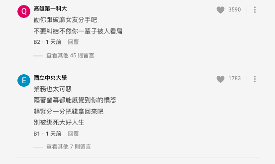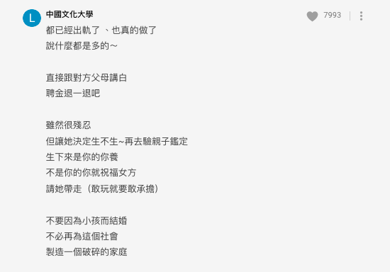 網友都勸喻台男跟女友分手,認為女友都已經出軌了,説甚麼也是多的。應該直接跟父母坦白,退掉聘金。還說「不要因為小孩而結婚,不必再為這個社會製造一個破碎的家庭」。