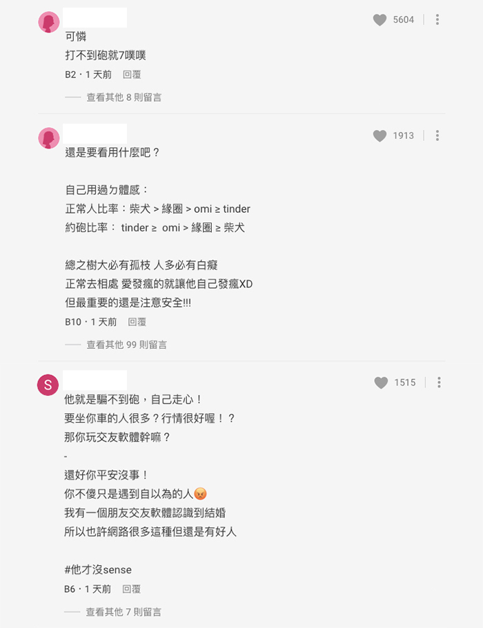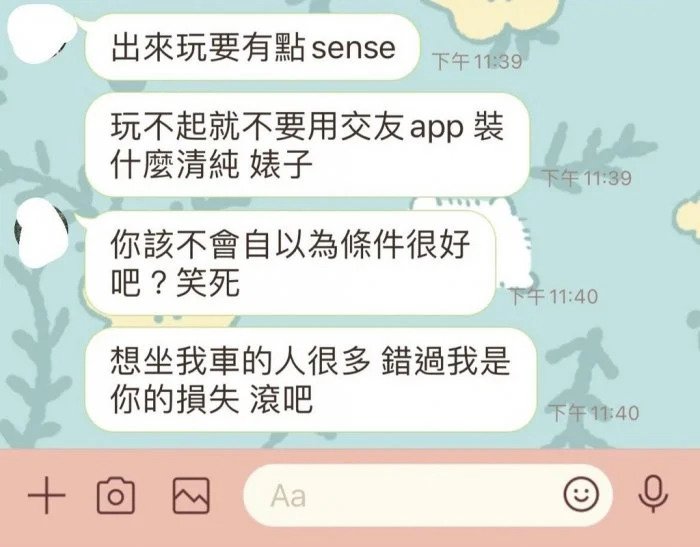 誰知樓主回家後,竟然收到男生的訊息大罵她「婊子」!男生表示出來玩要有 sense,玩不起的話就不要用交友 APP,罵樓主只是在裝清純。他還超自大的表示「想坐我車的人很多,錯過我是你的損失」,叫樓主「滾吧」!
