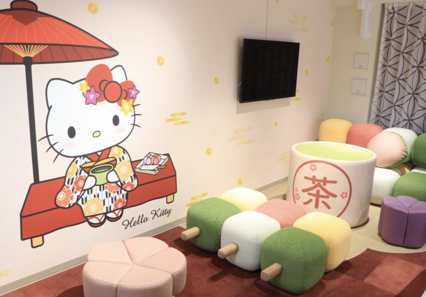 最特別是房間的客廳有一個以抺茶和麻糬為主題的休憩區,既可愛又舒適呢!