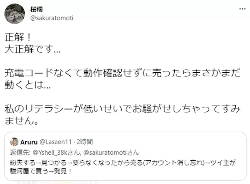 結果一打開Twitter後發現上一手機主桜糯(Sakuratomoti)在2011年6月的時候曾經發文抱怨手機遺失,表示若果有人在新宿撿到iPhone 3GS,可能就是我的,於是現機主泥散らす於Twitter聯繫上前主人!畢竟2011年遺失的手機,11年後卻能於二手店發現,甚至還能聯繫到前主人,讓日本網友們都直呼這簡直是奇蹟。