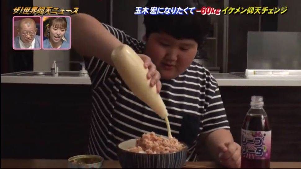 日本綜藝節目《ザ!世界仰天ニュース 》日前就訪問居於本靜岡縣土屋家,在四兄弟姊妹年紀最小的土屋善彥在小時後身形十分瘦削,但貪吃的他會在父母入睡後偷偷地食宵夜,他最愛就是食白飯配金槍魚和美乃滋,再加上汽水,非常豐富!