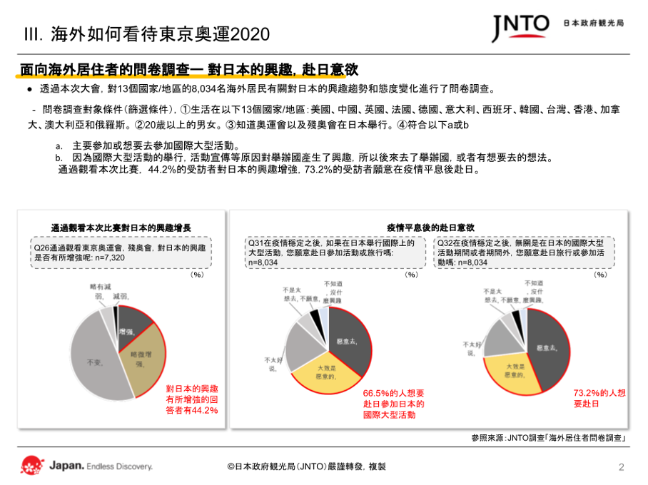 ・通過觀看本次大會的結果,有44.2%的受訪者表示對日本的興趣大大提高,73.2%的受訪者表示在新冠病毒疫情得以控制之後願意赴日旅行。