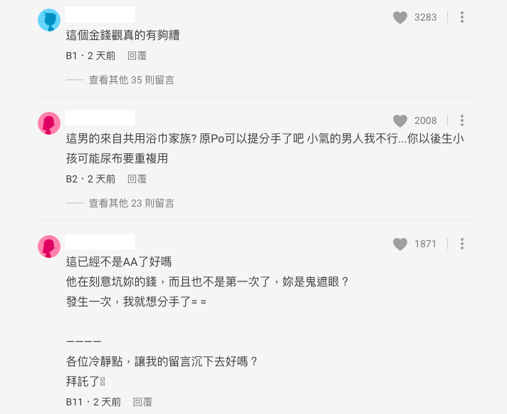 網友表示「這個金錢觀真的有夠糟」,還有網友搞笑留言「你以後生小孩可能尿布要重複用」!其他網友認為男友不是貪小便宜這麼簡單,是在刻意騙她錢,應該直接分手!